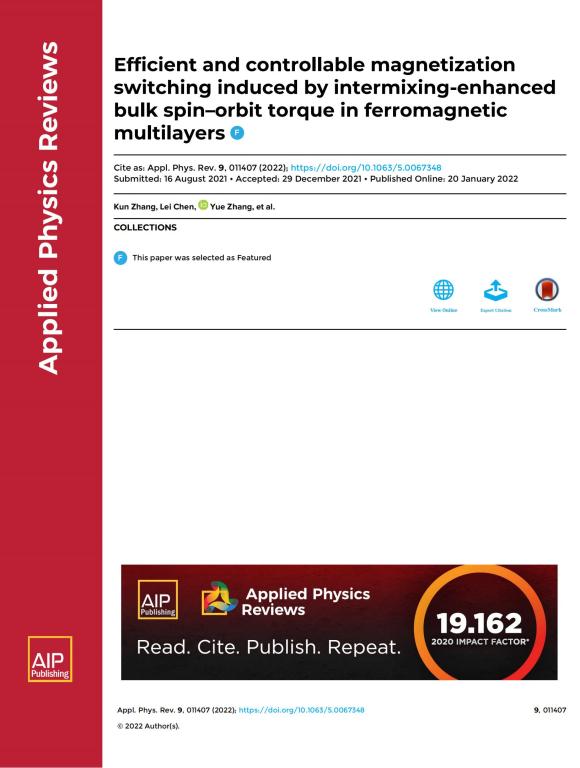 [1] K. Zhang, L. Chen, Y. Zhang, B. Hong, Y. He, K. Lin, Z. Zhang, Z. Zheng, X. Feng, Y. Zhang, Y. Otani, and W. Zhao, Efficient and Controllable Magnetization Switching Induced by Intermixing-enhanced Bulk Spin–orbit Torque in Ferromagnetic Multilayers, Appl. Phys. Rev. 9, 011407 (2022).(IF=19.2,选为亮点论文)